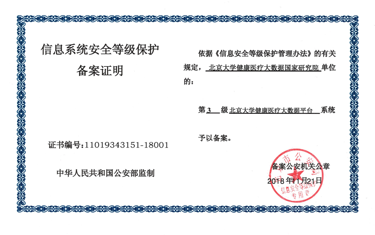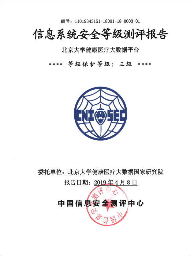 等级保护共分为五级,第三级属“监管级别”,是国家对非银行机构的最高级认证。北京大学健康医疗大数据平台有能力免受来自外部威胁源发起的恶意攻击、较为严重的自然灾难、以及其他程度的危害威胁所造成的主要资源损害;能够有效保障个人信息不受窃取或损坏;有效防范黑客等不法分子通过网络展开的各种攻击以及病毒传播;具备较强的信息数据安全保护能力,避免医疗和患者个人信息遭到泄露。通过国家信息系统安全等级保护三级测评,标志着平台已建立较为完善的信息安全保护体系,在安全技术、系统管理、应急保障等方面都达到了国内领先标准。