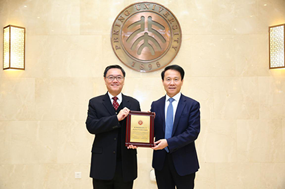 在全场热烈的掌声中,韦俊贤、詹启敏、李宇宁共同签署捐赠协议。詹启敏代表学校授予康师傅控股有限公司北京大学杰出教育贡献奖。本日上午,韦俊贤一行还参观了北大医学科创中心、北京大学健康医疗大数据国家研究院。
