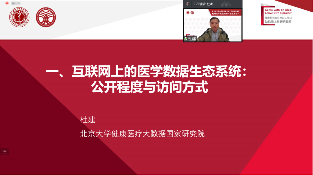 北京大学健康医疗大数据国家研究院杜建副研究员讲授《互联网上的医学数据生态系统:公开程度与访问方式》、《可计算的医学知识》等