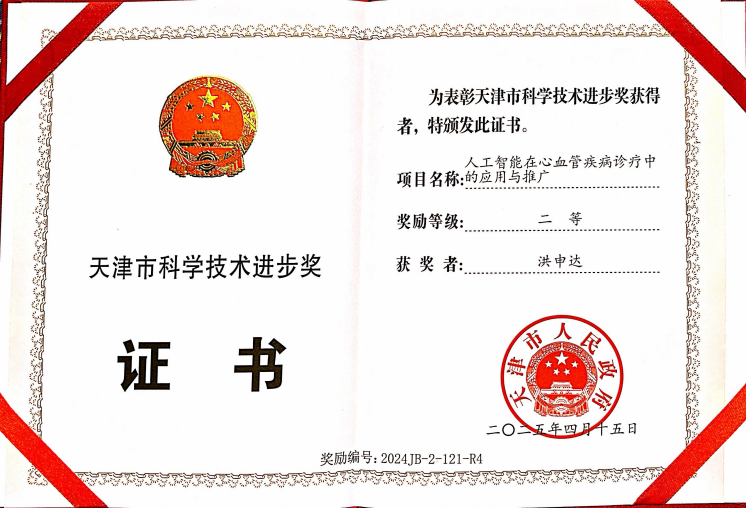 近日,研究院洪申达助理教授参与完成的“人工智能在心血管疾病诊疗中的应用与推广”项目,获得2024年度天津市科技进步奖(公益类)二等奖。该项目的主要完成单位为天津医科大学第二医院、北京大学,主要完成人为陈康寅、刘彤、陶华岳、洪申达、张昊、韩津阳。